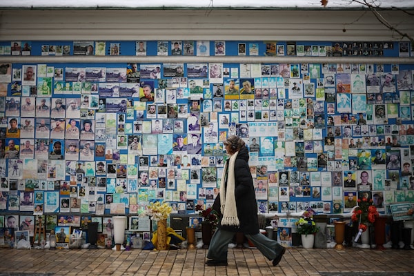 A person walks past The Wall of Remembrance of the Fallen for Ukraine in Kyiv on Feb. 23. The war reached the four-year mark on Tuesday, Feb. 24.HENRY NICHOLLS/AFP/Getty Images