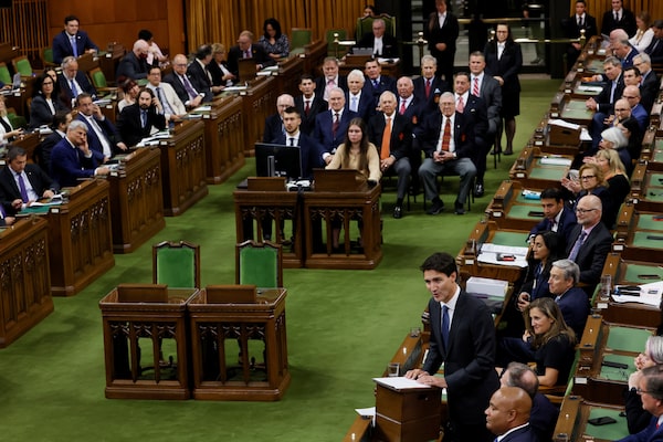 Prime Minister Justin Trudeau speaks, with members of the Canadian ice hockey team from the 1972 Summit Series in the background, in the House of Commons on Parliament Hill in Ottawa on Sept. 22.BLAIR GABLE/Reuters