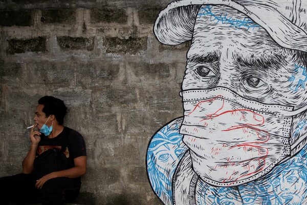 A man smokes next to a mural of a man in a protective mask in Manila in 2020, early in the COVID-19 pandemic.Eloisa Lopez/Reuters