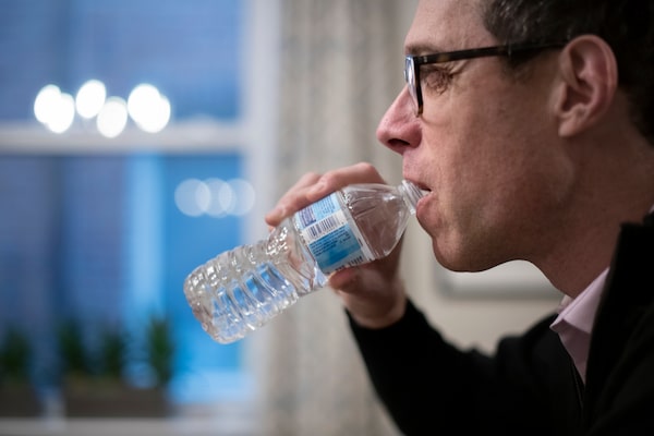 Mr. Smith sips from a plastic water bottle. He's experimented on himself to see how common pollutants, including microplastics, have ended up in his body.Fred Lum/The Globe and Mail