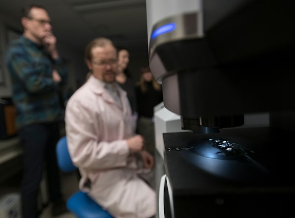 As he ate the packaged food for several nights, he'd use sterilized glass jars to collect stool samples. Here, Mr. Smith confers with associate professors Nathan Eddingsaas, left, and Christy Tyler, right, as they examine the results at New York state's Rochester Institute of Technology.Photos: Fred Lum/The Globe and Mail