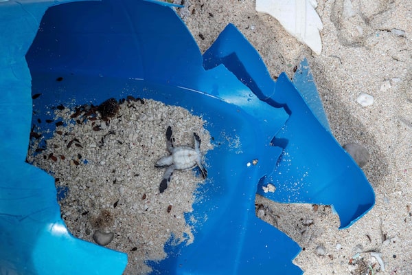 Waste is reaching some of the most obscure parts of the planet. This 2019 photo shows a baby turtle on a plastic container on Henderson Island, an uninhabited part of the South Pacific's Pitcairn archipelago. Ocean currents that carry waste from thousands of kilometres away have left it with one of the highest concentrations of plastic pollution on Earth.Iain McGregor/Stuff/AFP/Getty Images