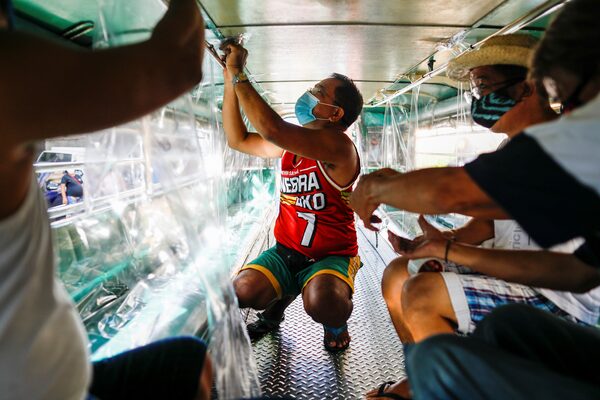 The driver of a jeepney, a style of bus ubiquitous in the Philippines, installs plastic sheets to keep riders apart in Quezon City earlier this month. The COVID-19 pandemic has increased demand for plastic sanitary items like screens, masks and gloves.Eloisa Lopez/Reuters