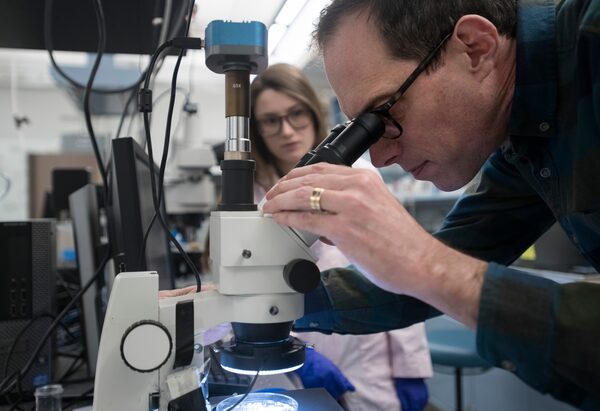A chemically treated and filtered stool sample from Rick Smith awaits inspection under a microscope at a lab in Rochester, N.Y., this past February. Learn more in this video about Mr. Smith's experiment to find out how much microplastic would end up in his body.