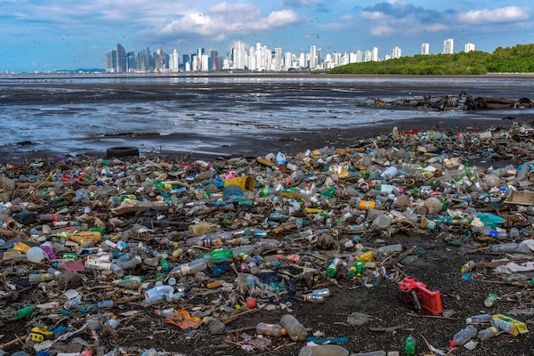 Plastic waste and other garbage piles up on shore in the Costa del Este neighbourhood in Panama City this past June 8, World Oceans Day. About 400 million metric tons of plastic waste is produced globally every year.LUIS ACOSTA/AFP via Getty Images