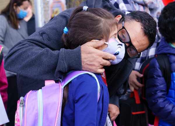 A father kisses his daughter before entering the schoolyard at Philippe-Labarre Elementary School in Montreal.Paul Chiasson/The Canadian Press/The Canadian Press