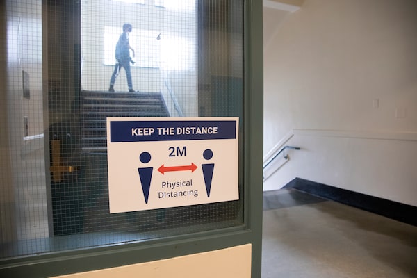 A sign reminds people to keep their distance at Hastings Community Elementary School in Vancouver,Taehoon Kim/The Globe and Mail/The Globe and Mail