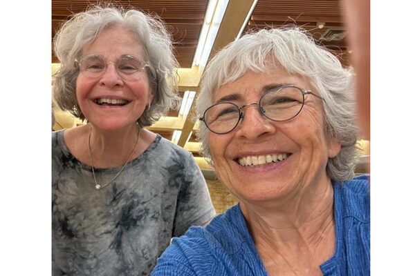 Friends Lynne Mitchell, left, and Vivian Silver at the dining hall at Kibbutz Be’eri in May, 2023.Supplied