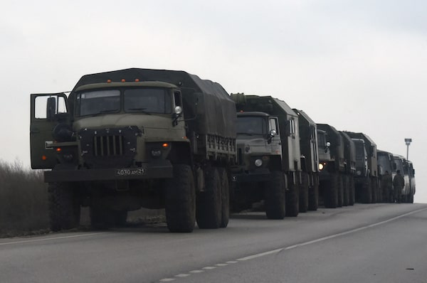 Russian military trucks and buses line the side of a road in Russia's southern Rostov region, which borders the self-proclaimed Donetsk People's Republic, on Feb. 23.STRINGER/AFP/Getty Images