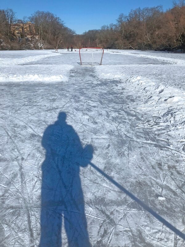And so less than a week later, on a perfect Thursday morning in February, I was back at Catfish Pond. All the families were working and homeschooling, so the pond was clear and the COVID-19 risk was low. The blue sky gave texture to the grey ice, now chewed up, pebbly and streaked with thin shovel lines of snow and a week’s worth of skate etchings.