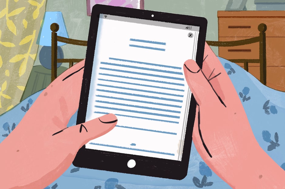 To be clear, it’s the Mini I adore, not the big clunky number that might as well be a laptop. (When I want a laptop, I use my laptop.) The Mini is the perfect size, because it’s the size of a book. You flip open the cover like a book, you advance the pages like a book. And books are the best-loved objects of my life, my most faithful diner dates, my insomnia companions, my gateways to wherever. I have loved them since before memory, but during a clammy stretch of early middle age, I almost gave up on them. My eyes were changing every few months. They were tired at night. Reading began to hurt. And then in 2012, huzzah, this magic, glowing book. I am a late adopter on all things tech, but I learned the Mini in a minute.