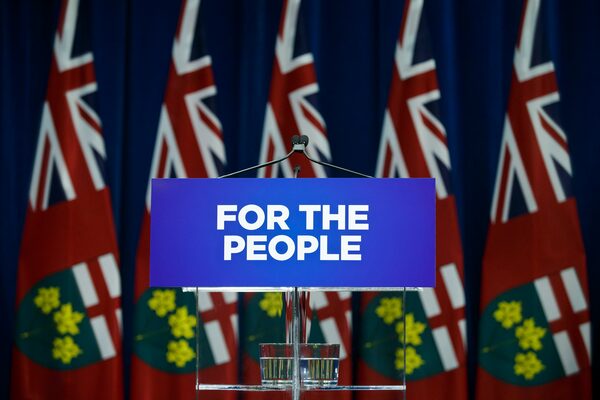 The podium is seen empty as Ontario Premier Doug Ford delays a news conference in Toronto on Sept. 10, 2018.COLE BURSTON/The Canadian Press