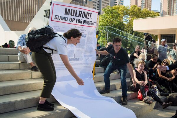 A giant Charter of Rights is rolled out for people to sign, addressed to Attorney-General Caroline Mulroney. The government invoked the Charter's Section 33, the notwithstanding clause, to justify its cuts, despite a judge's ruling that they were unconstitutional.Tijana Martin/The Canadian Press