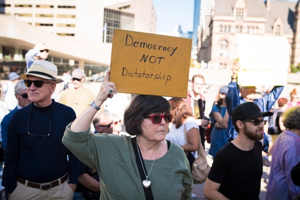 A crowd gathers outside Toronto's City Hall for the Save our Democracy and Rights event on Sept. 12, 2018, a protest against the Ford government's cuts to city council.Tijana Martin/The Canadian Press