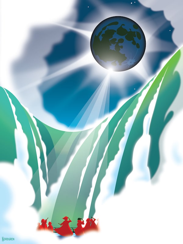 This is the moment of totality. Only at this moment is it safe, and necessary, to remove your eclipse glasses and see the sun turned black in a daytime sky the colour of cobalt surrounded on all sides by a strange sunset glow that rings the horizon. And streaming outward from the dark sun is that corona I read about when I was young. At a temperature of over a million degrees it’s the hottest thing any human being will ever see with their own eyes and is only visible for those who have made the journey into the path of totality. It’s one of the many reasons that settling for a 99-per-cent partial eclipse isn’t 99 per cent of the show. Make the effort to go to totality, and you will delight in those moments of darkness.