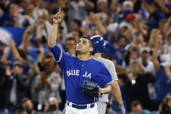 Toronto Blue Jays relief pitcher Roberto Osuna points in the air after the Jays 7-1 win over the Kansas City Royals in game five of the American League Championship Series Oct 21, 2015 in Toronto.Masrk Blinch