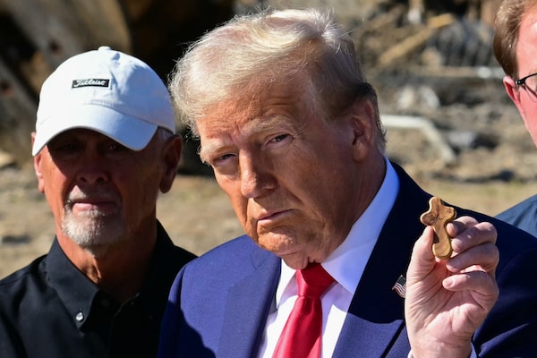 Former US President and Republican presidential candidate Donald Trump holds up a gift he received from local residents as he speaks to the media in Swannanoa, North Carolina, on October 21, 2024, after observing cleanup efforts in the aftermath of Hurricane Helene, which devastated the region.JIM WATSON/AFP/Getty Images