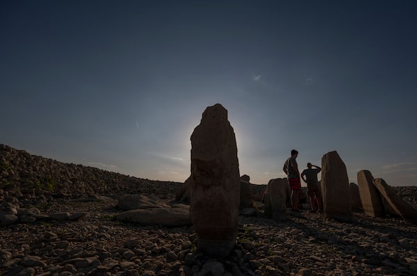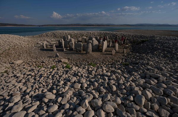 Tourists look at the Dolmen of Guadalperal in Spain this past August. Europe's historic drought dried up the reservoir that normally covers the stones, erected up to 7,000 years ago. For many, the drought was a glimpse of climate-change scenarios that scientists had long foreseen – and of ancient sites like this.PIERRE-PHILIPPE MARCOU/AFP via Getty Images