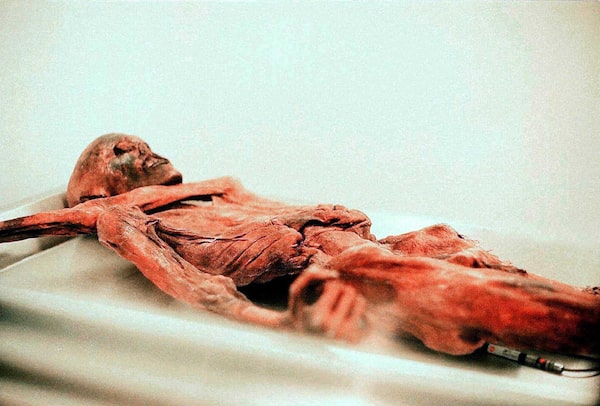 A specially designed ice capsule preserves the remains of Otzi for display in Bolzano, Italy, in 2018. The Neolithic man is believed to have died more than 5,000 years ago.AFP / Getty Images