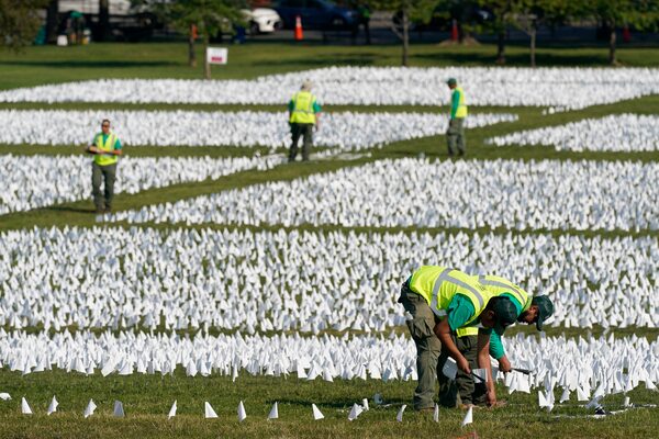 Workers plant white flags as part of artist Suzanne Brennan Firstenberg's temporary art installation, In America: Remember, in remembrance of Americans who have died of COVID-19, on the National Mall in Washington, Sept. 15, 2021.Patrick Semansky/The Associated Press