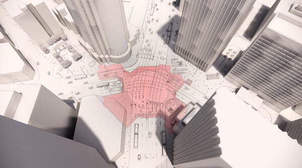 The pink area in this digital rendering shows the span of the waterproof layer that was protecting the underground concourse at the intersection.Supplied