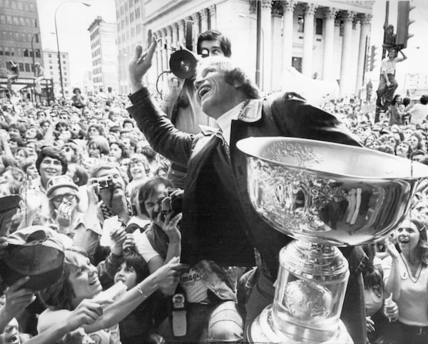 Hockey player Bobby Hull of the Winnipeg Jets waves to well-wishers during a victory parade on May 28, 1976 along Portage Avenue after the hockey team defeated the Houston Aeros to win the World Hockey Association championship.The Canadian Press