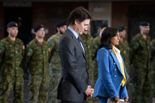 Prime Minister Justin Trudeau stands alongside Defence Minister Anita Anand, in Toronto, on Feb. 24.Chris Young/The Canadian Press