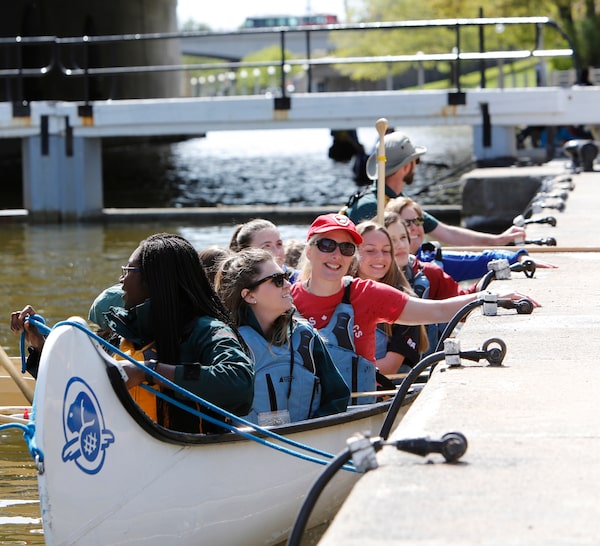 Catherine McKenna, in a red hat and shirt, arrives at a 2018 news conference after paddling the Rideau Canal to kick off the official Parks Canada season.David Kawai/The Canadian Press