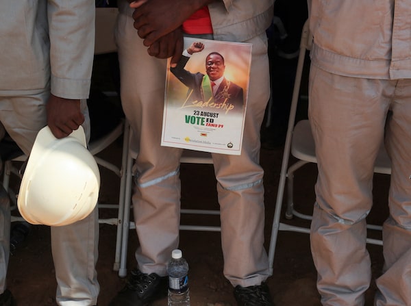 Workers are seen holding a picture of Zimbabwe's President Emmerson Mnangagwa on July 5.PHILIMON BULAWAYO/Reuters