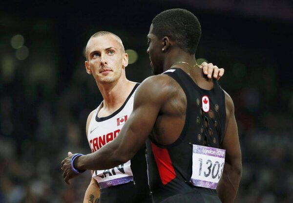 Canada's Jared Connaughton (L) and Justyn Warner react after the men's 4x100m relay final at the London 2012 Olympic Games at the Olympic Stadium August 11, 2012. Canada finished third but were disqualified.LUCY NICHOLSON/Reuters