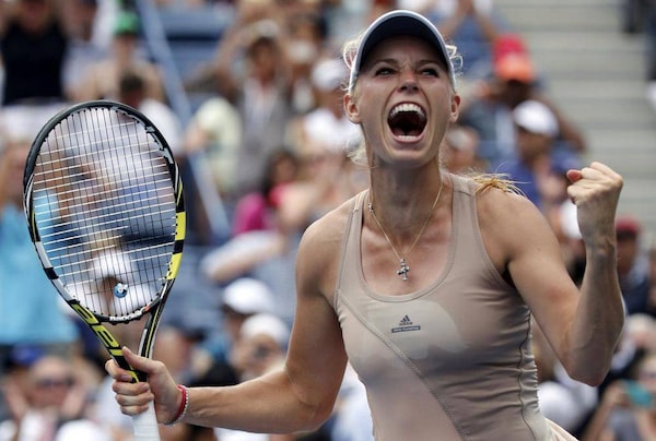 Caroline Wozniacki of Denmark celebrates her win over Maria Sharpova at the 2014 U.S. Open tennis tournament in New York, August 31, 2014.RAY STUBBLEBINE/Reuters