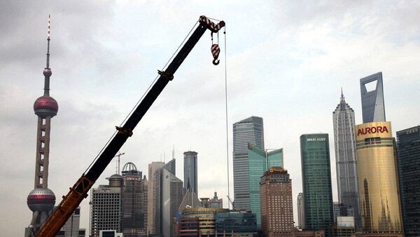 A crane hoists construction material in front of a backdrop of high rising buildings in ShanghaiEugene Hoshiko