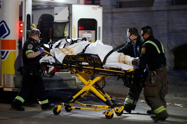 Paramedics wear respirators while responding to a medical call in downtown Winnipeg, on Nov. 1, 2020.SHANNON VANRAES/Reuters