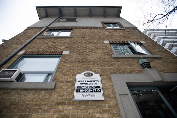 A sign shows apartments available for rent in a building at 608 Church St. in Toronto on. Jan 28, 2021.Fred Lum/The Globe and Mail