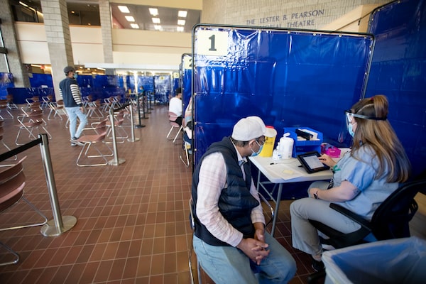 Hyder Ali, 41, receives a Pfizer-BioNtech vaccination from registered nurse Julia Noce at a clinic at the Bramalea Civic Centre in Brampton, Ont., on May 17, 2021.Fred Lum/The Globe and Mail