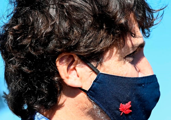 Canadian Prime Minister Justin Trudeau wear his mask as he takes part in a ground breaking event at the Iamgold Cote Gold mining site in Gogama, Ont., on Sept. 11, 2020.The Canadian Press