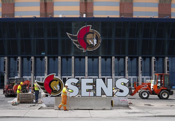 Landscapers work around Ottawa Senators NHL team signage at the Canadian Tire Centre, in June, 2023. The Senators announced last month a deal to purchase 11 acres near downtown Ottawa from the crown corporation that oversees public land in the capital region.The Canadian Press