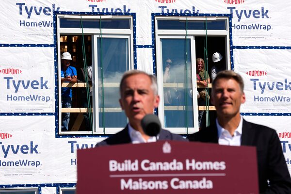 Builders look on from a residential construction site in Ottawa as Mr. Carney and Minister of Housing and Infrastructure Gregor Robertson announce the launch of Build Canada Homes, a new federal agency created to accelerate affordable housing construction across the country, in September, 2025.Justin Tang/The Canadian Press