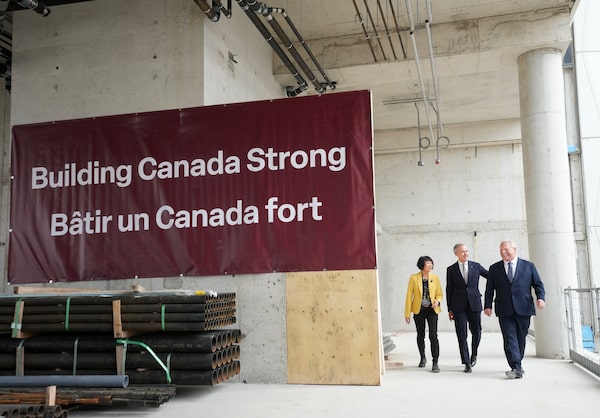 Prime Minister Mark Carney, Toronto Mayor Olivia Chow, and Ontario Premier Doug Ford arrive at a new condo development in Toronto on March 30 to make an announcement about a combination of tax cuts and spending that they hope will stimulate homebuilding in the province.Nathan Denette/The Canadian Press