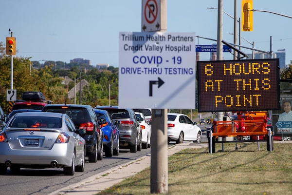 People wait in their cars at the Credit Valley Hospital's drive-thru COVID-19 testing facility in Mississauga, on Sept. 18, 2020.CARLOS OSORIO/Reuters