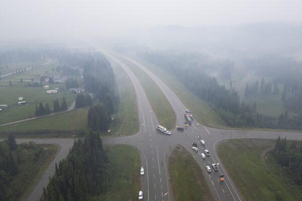 Vehicles are stopped at a blockade west of Hinton, Alta on Highway 16 to Jasper National Park on July 25, 2024. At the checkpoint, RCMP turned away anyone without a respirator, citing deteriorating and hazardous air quality from the Jasper townsite fire.Gavin John/The Globe and Mail