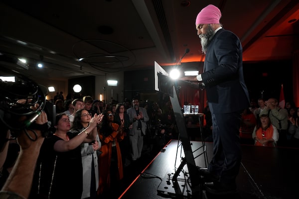 New Democratic Party Leader Jagmeet Singh addresses supporters at his campaign headquarters on election night, in Burnaby, B.C. on April 28.Darryl Dyck/The Canadian Press