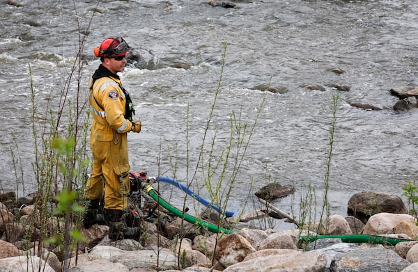 A firefighter monitors a pump in a river bed used for wildfire sprinklers in the evacuated neighbourhood of Grayling Terrace in Fort McMurray, Alta., on May 16.Jeff McIntosh/The Canadian Press