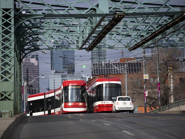 A streetcar heads east onto the Queen St. Viaduct, on Queen St. East in Toronto, on March 16 2021.Fred Lum/the Globe and Mail