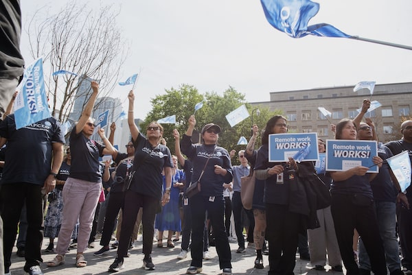 Ontario public-sector employees protest a return-to-office mandate at Queen's Park in Toronto, Sept. 18.Duane Cole/The Globe and Mail