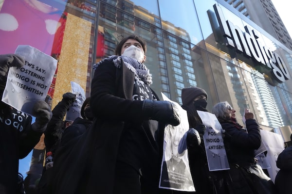 Protesters gather outside an Indigo store in Toronto, on Nov. 30, 2023. The demonstration, organized by the group "Jews Say No to Genocide," gathered outside the bookstore chain owned by Heather Reisman, was partly in response to arrests made on Nov. 10 after the store was vandalized with red paint and had posters plastered on its window, claiming the Jewish founder of the company is 'funding genocide.'Chris Young/The Canadian Press