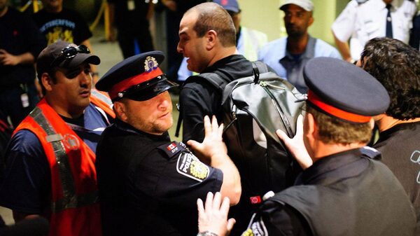 Police remove a person from the area as Air Canada baggage handlers stand outside during a a wildcat walkout at Toronto's Pearson International Airport early Friday March 23.Victor Biro/The Associated Press