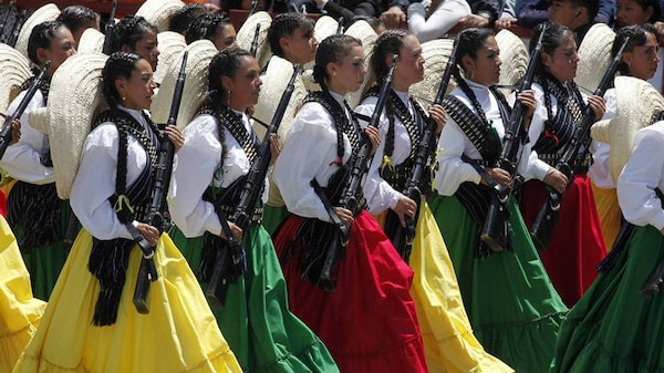 Female soldiers dressed in traditional clothing march during a military parade in culmination of bicentennial celebrations in Mexico City, September 16, 2010.ELIANA APONTE/Reuters