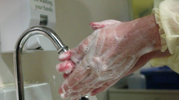 An infection control nurse demonstrates, for the media, how to wash one's hands properly to protect themselves against contracting SARS during a tour of Vancouver's first SARS clinic at St. Vincent's Hospital, April, 2003. (CP PHOTO/Richard Lam)RICHARD LAM/The Canadian Press