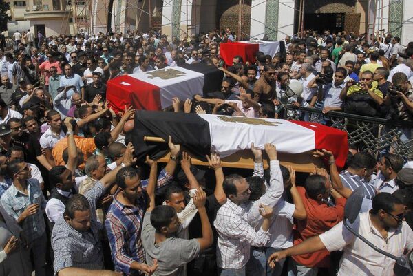 Egyptian relatives and colleagues of policemen who were killed during Wednesday's clashes carry coffins covered with national flags during a military funeral in Cairo on Aug. 15, 2013. Egyptian authorities on Thursday raised the death toll from clashes the previous day between police and supporters of the ousted Islamist president, saying hundreds of people died and laying bare the extent of the violence that swept much of the country and prompted the government to declare a nationwide state of emergency and a nighttime curfew.Amr Nabil/The Associated Press